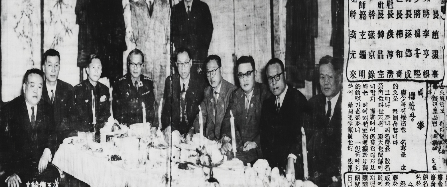 A imagem em questão mostra entre dez e doze homens ao redor de uma mesa com velas, exatamente o cenário de uma kisaeng-jip. A legenda divulgada pelo site insidetkd.com identifica o conjunto como a “태권도 명칭제정위원회”, a Comissão de Nomenclatura do Taekwondo, e aponta que o terceiro da esquerda é Choi Hong-hi. A foto foi repetida por décadas como prova visual do evento de 11 de abril de 1955.
